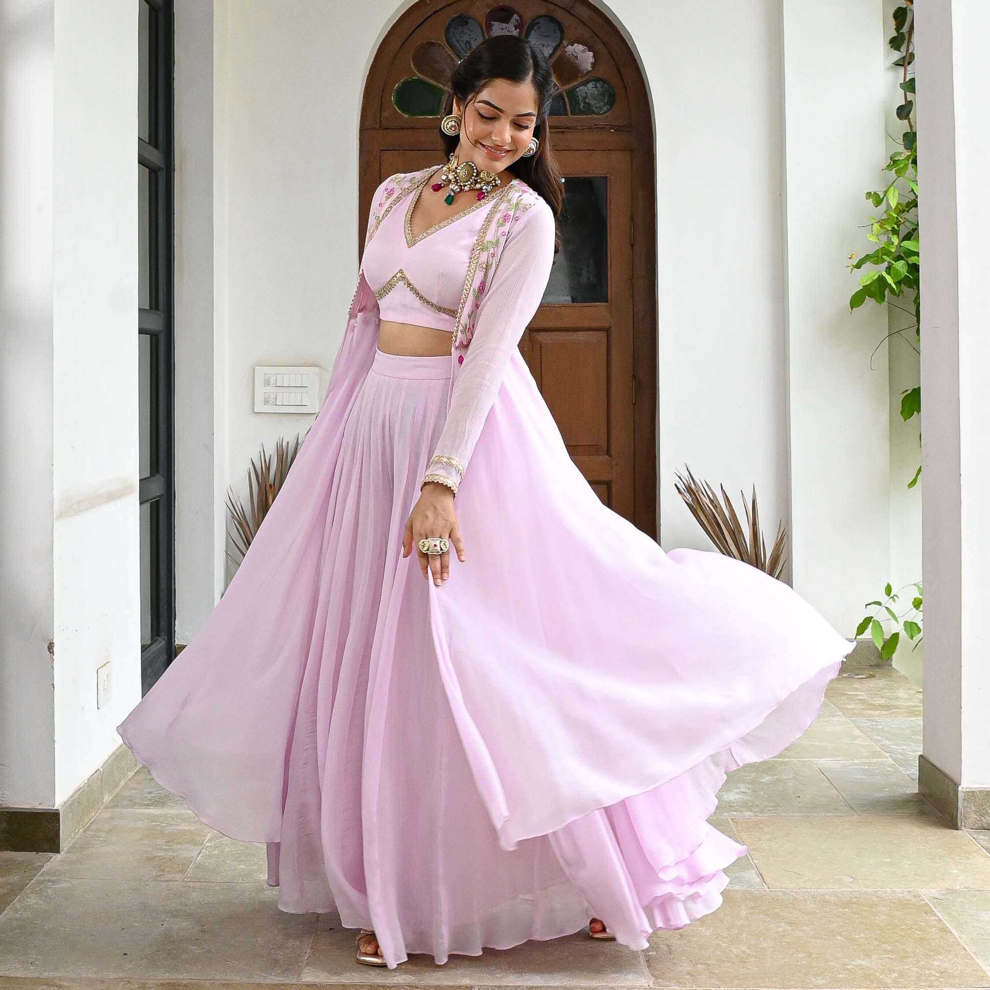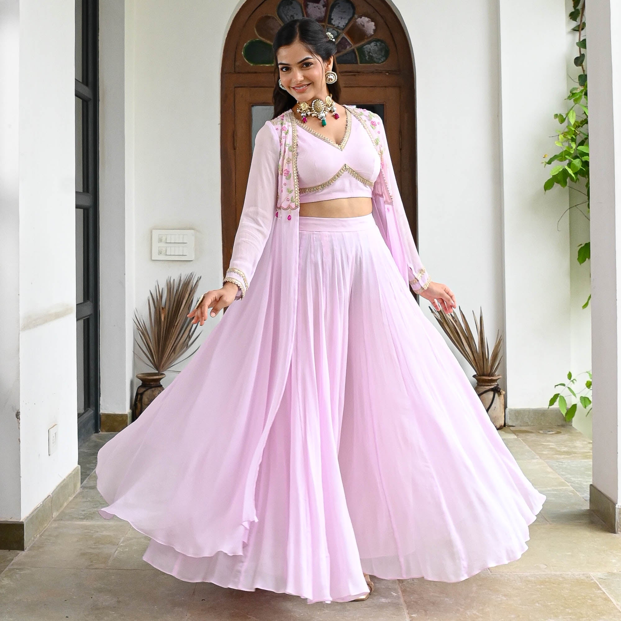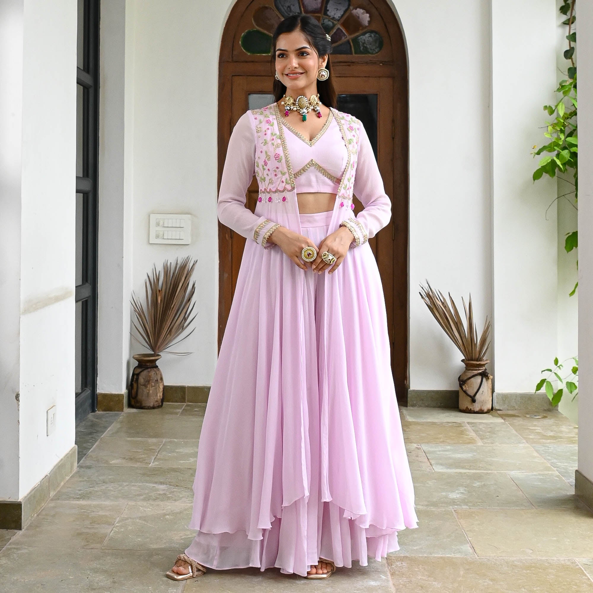 Soft, stylish, and statement-worthy, the Aniya Co-ord Set in baby pink chinon is a dreamy pick for modern festive dressing. Featuring a V-neck blouse and flared palazzos, it’s paired with a matching full-sleeve shrug adorned with delicate ched embroidery. Light, flowy, and elegant, this ensemble blends tradition and trend for a graceful yet contemporary look.