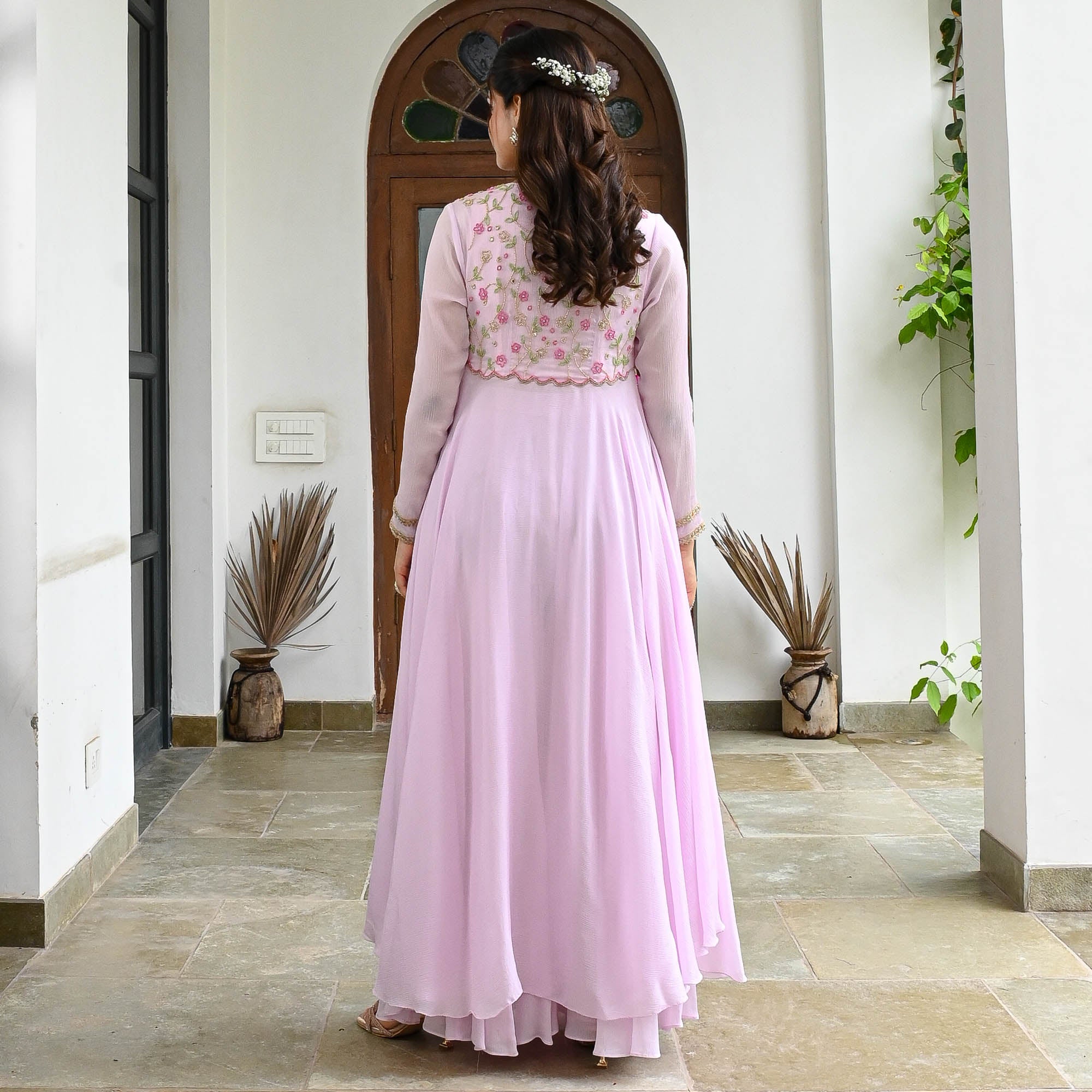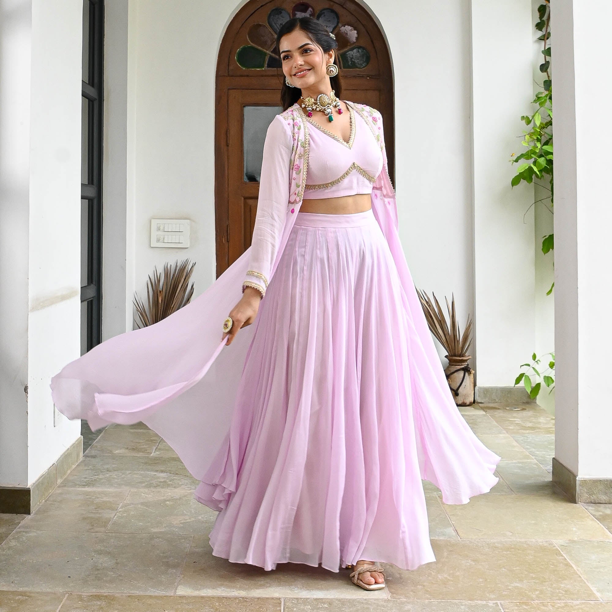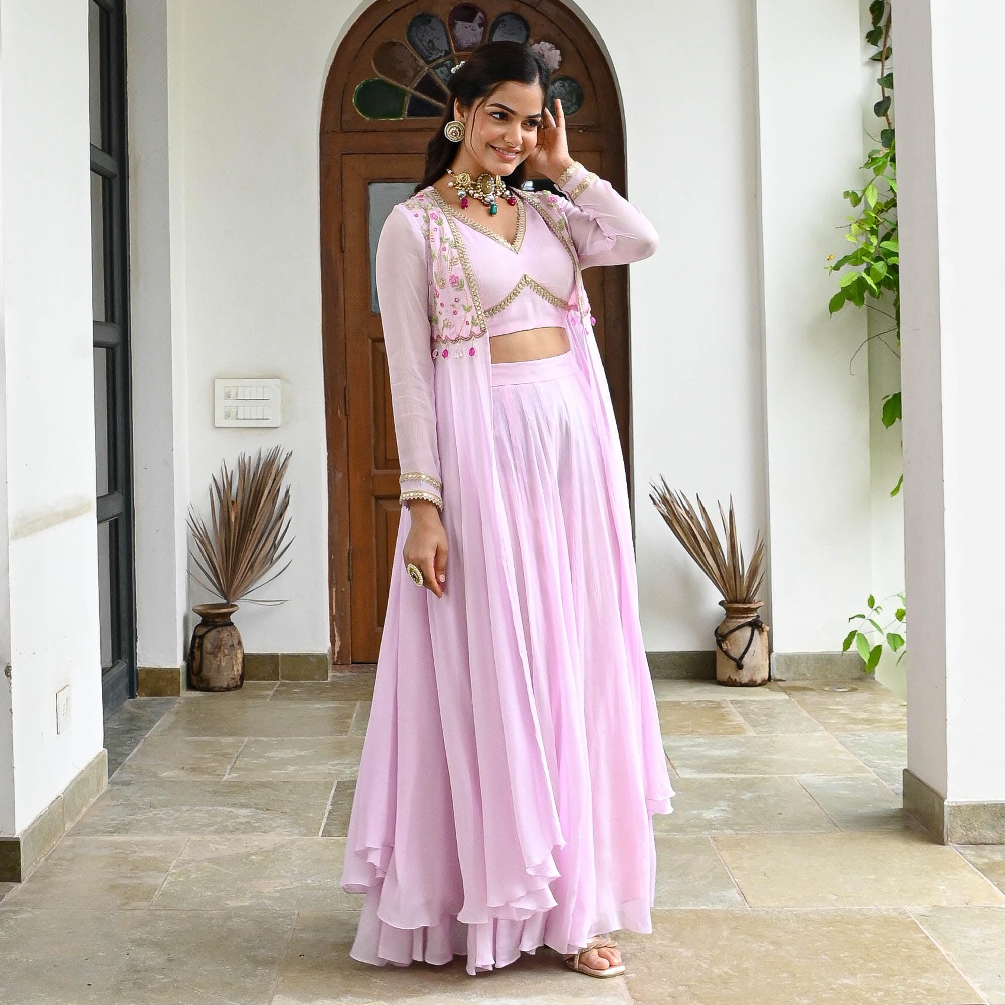 Soft, stylish, and statement-worthy, the Aniya Co-ord Set in baby pink chinon is a dreamy pick for modern festive dressing. Featuring a V-neck blouse and flared palazzos, it’s paired with a matching full-sleeve shrug adorned with delicate ched embroidery. Light, flowy, and elegant, this ensemble blends tradition and trend for a graceful yet contemporary look.