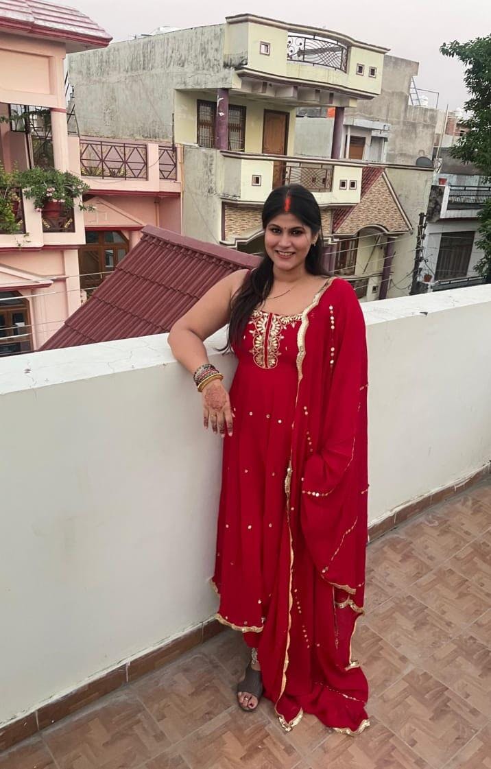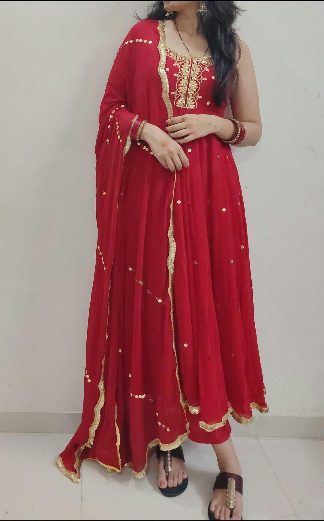 Experience the softness and comfort of cotton fabric paired with a sparkling gold and red colour combination. This sleeveless red piece is embellished with intricate gold work all over. It features matching pants and duupatta to complete the look. Celebrate the festival's love with this beautiful anarkali set!