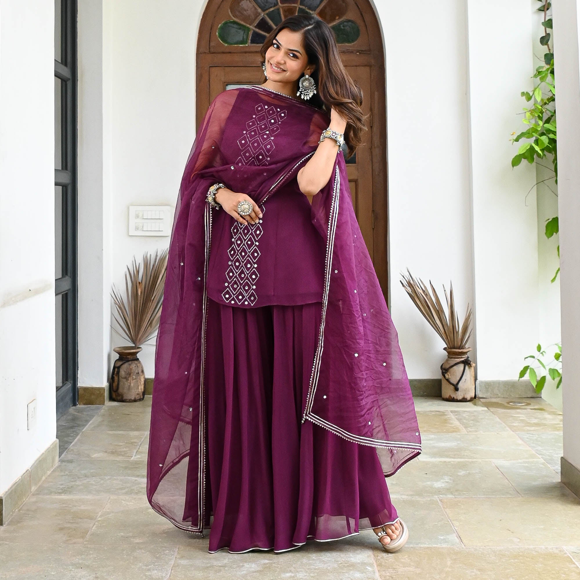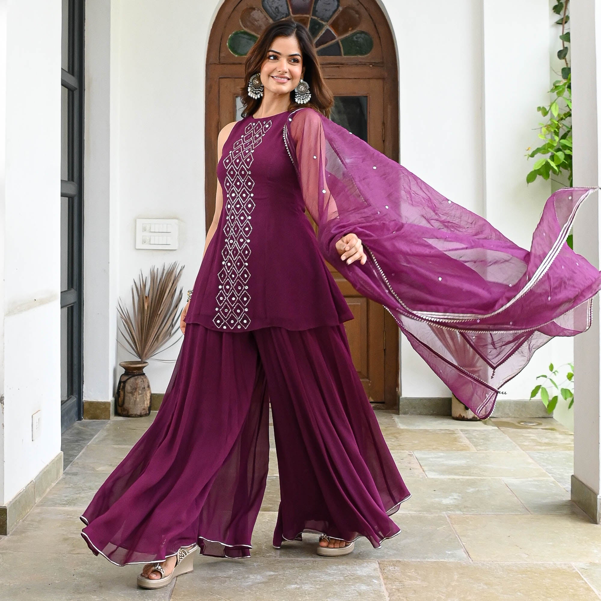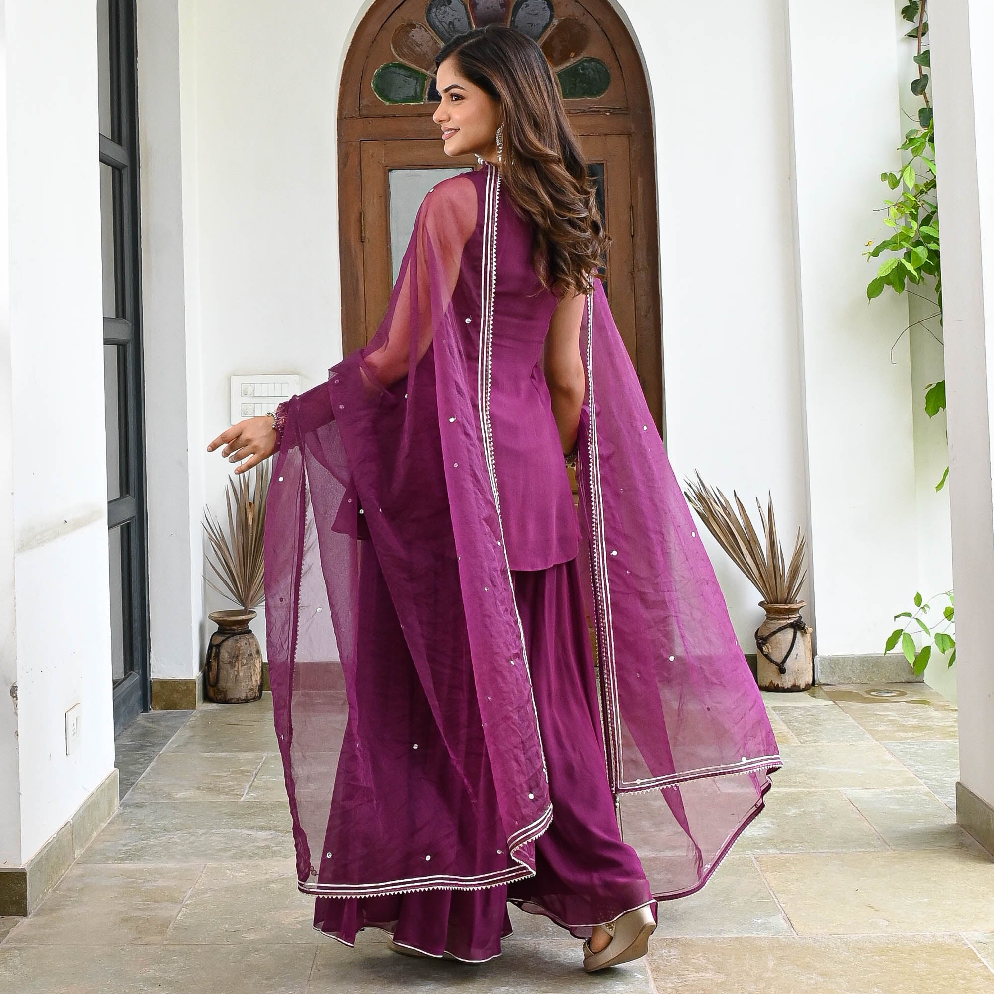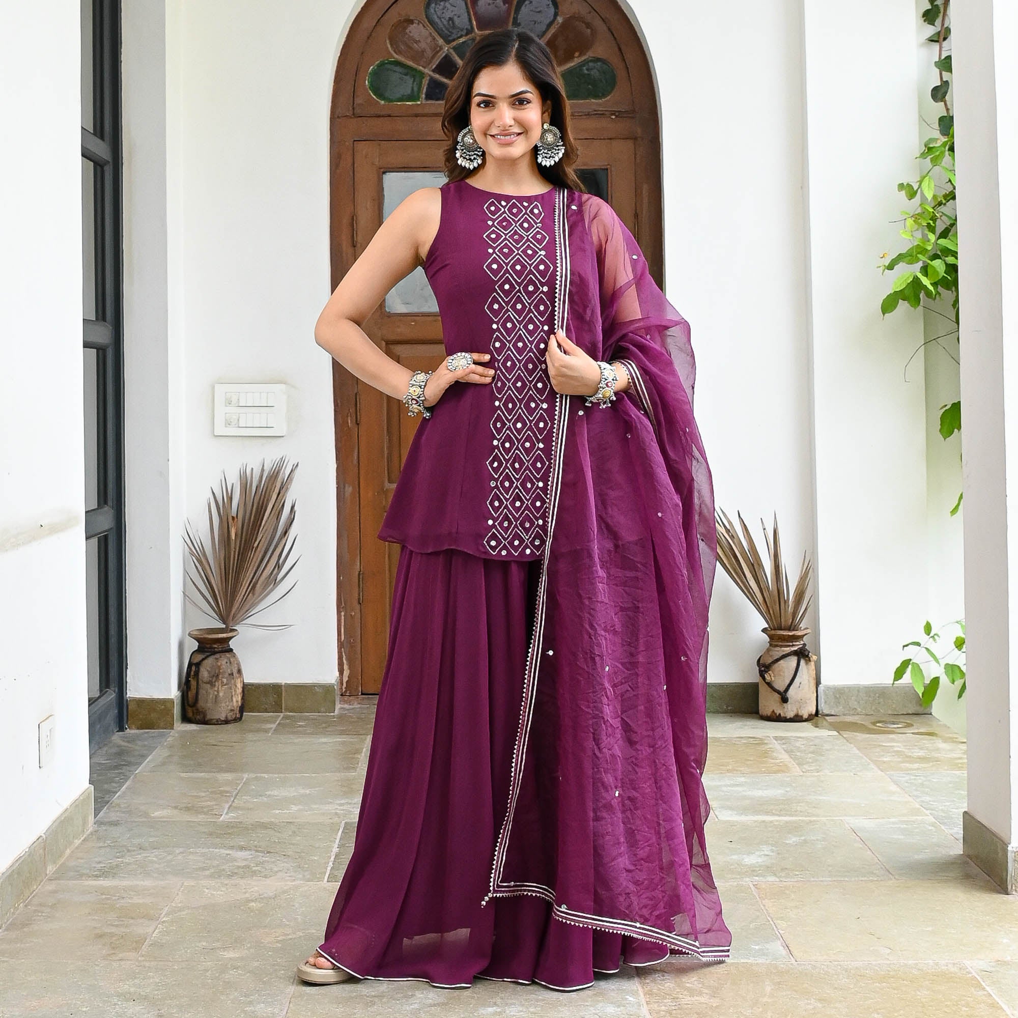 Elegant and enchanting, the Shivani Suit Set in wine georgette features a sleeveless, A-line short kurta adorned with intricate sequin and cut dana work. Paired with flowy flared palazzo pants and a matching organza dupatta, this ensemble strikes the perfect balance between traditional charm and modern flair—ideal for evening celebrations and festive gatherings.