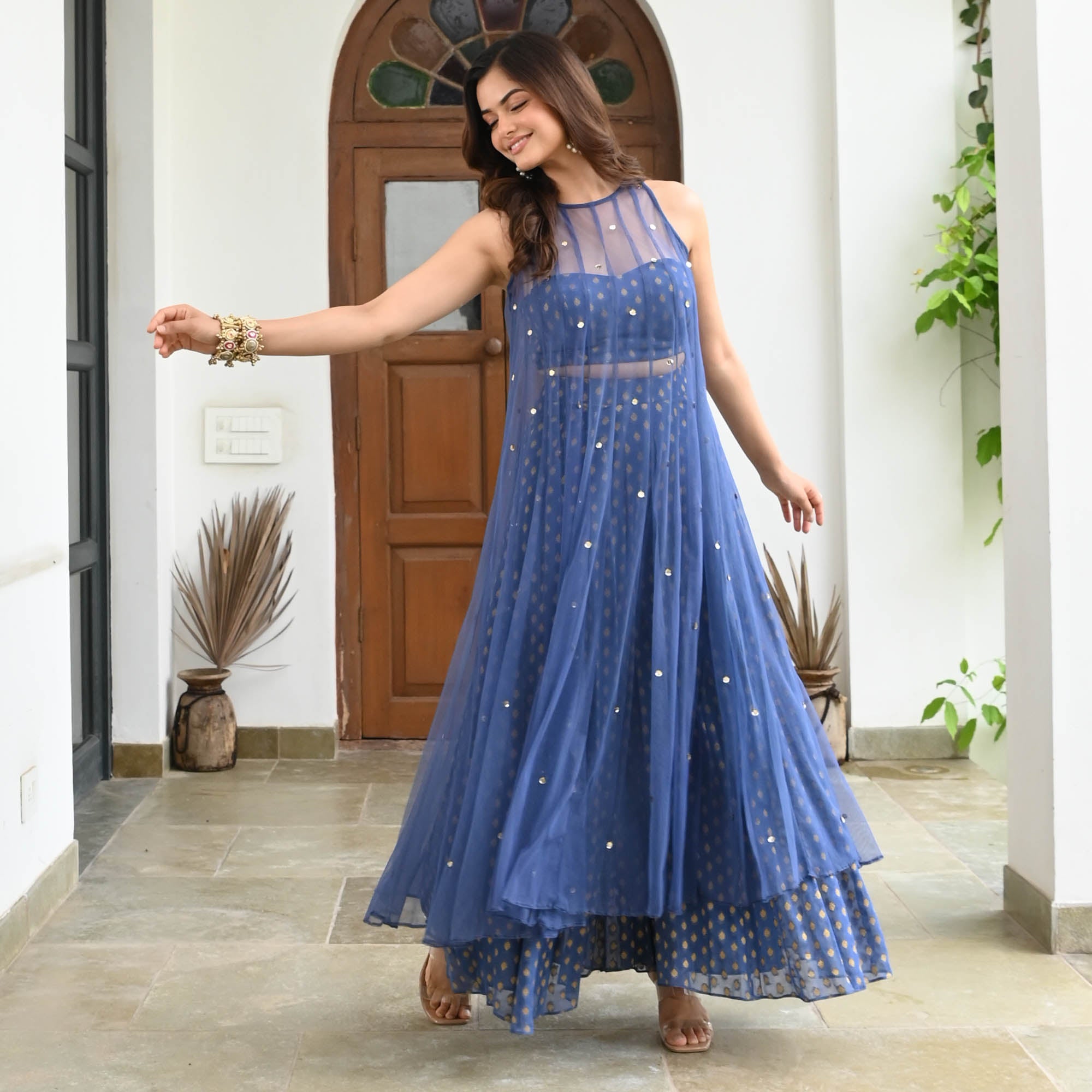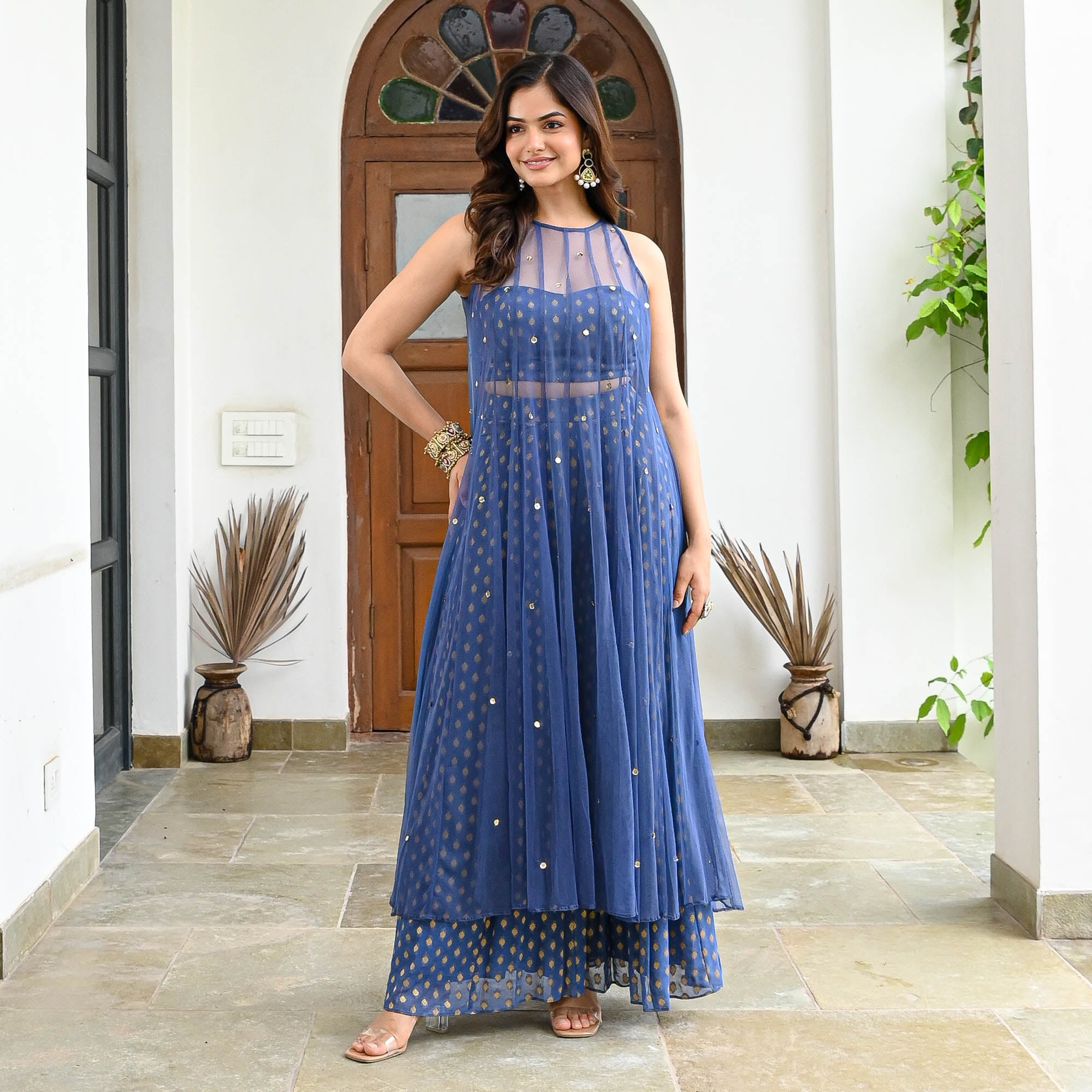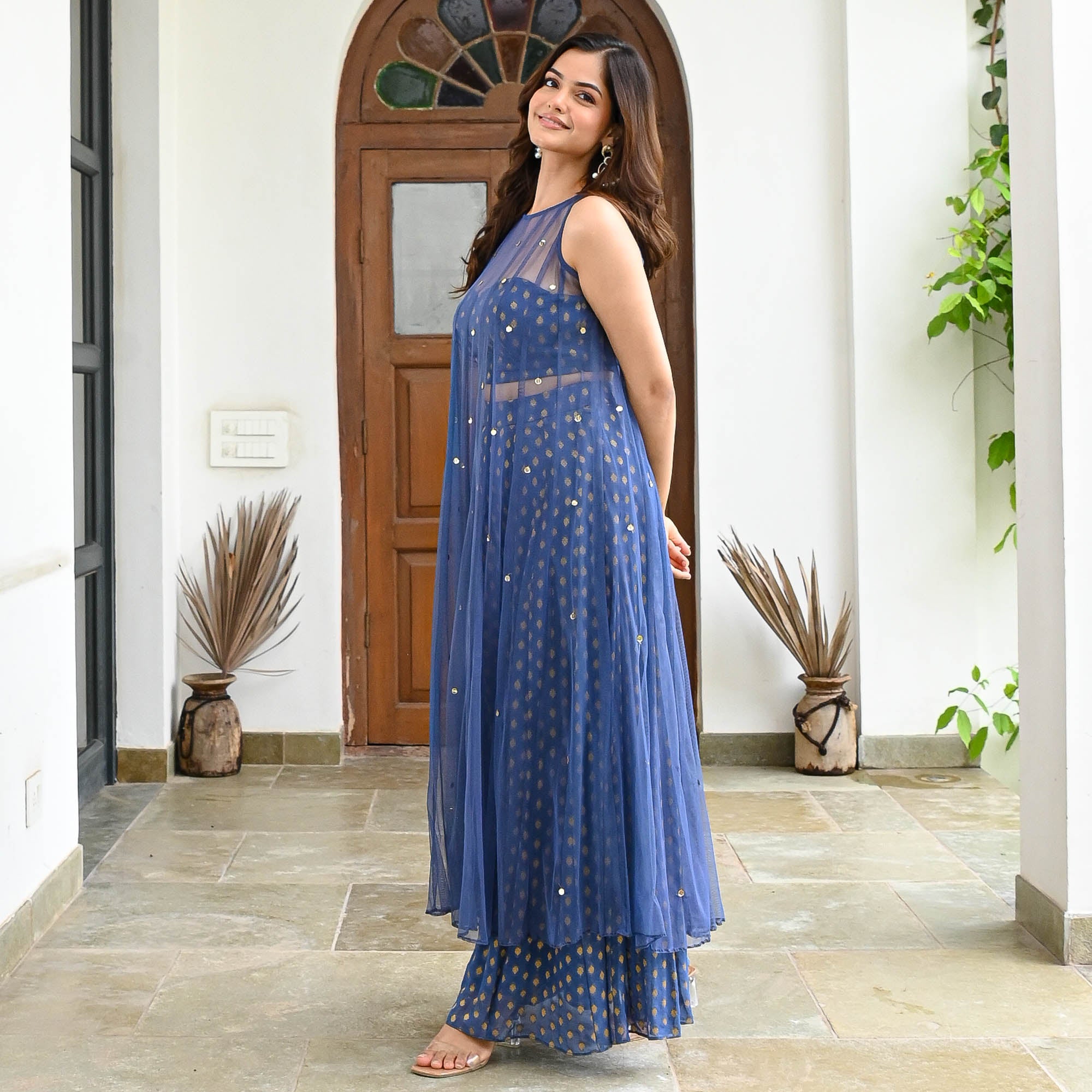 Chic and contemporary, the Zoha Co-ord Set in bluish grey jacquard makes a bold statement. Featuring a structured tube bustier and flared palazzos, this set is elevated with a sheer net overlay that adds a hint of drama and elegance. Perfect for cocktail nights or festive soirées, it’s a fusion look that turns heads effortlessly.