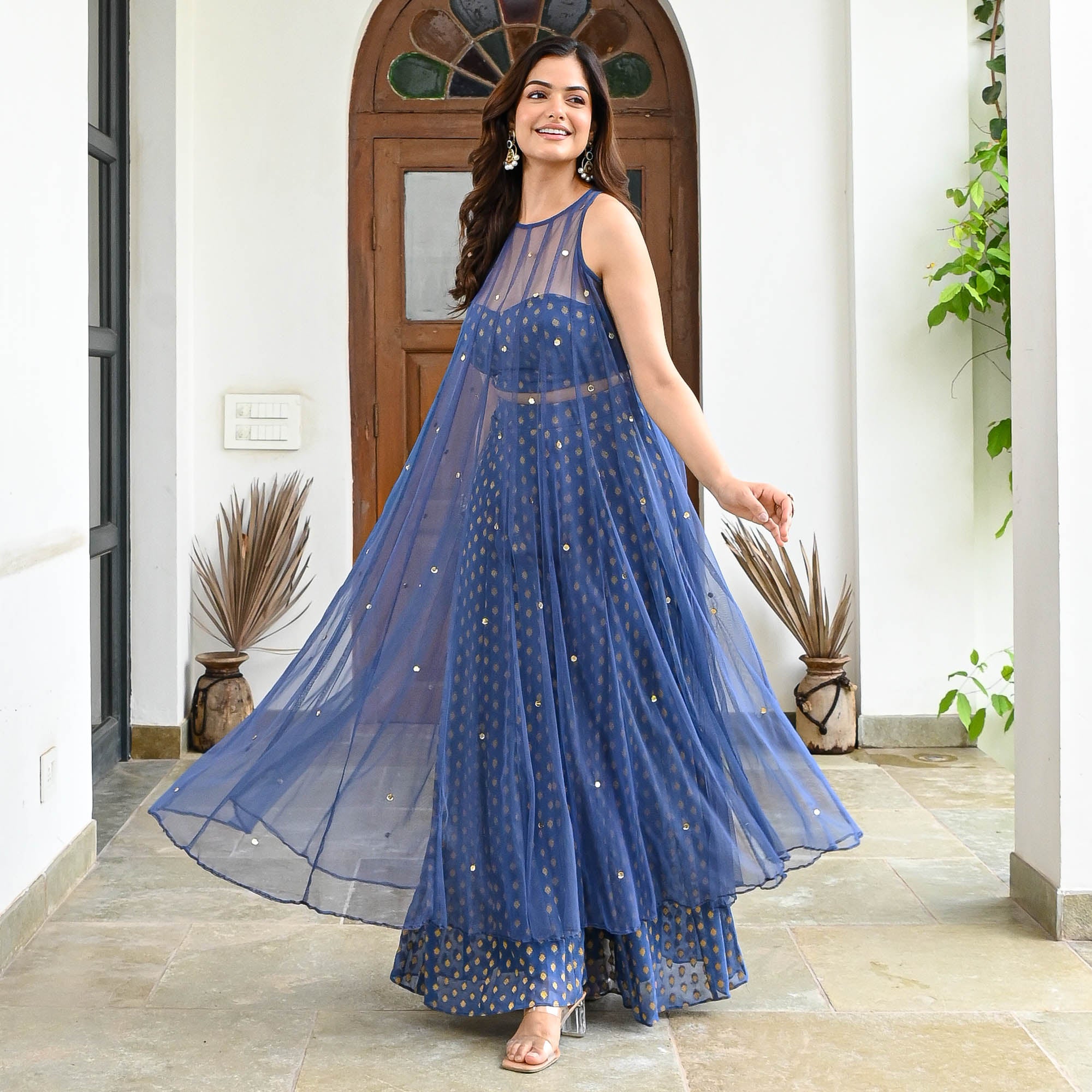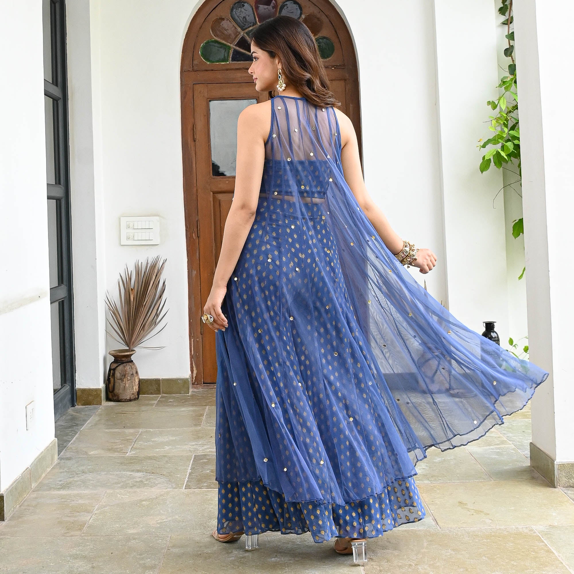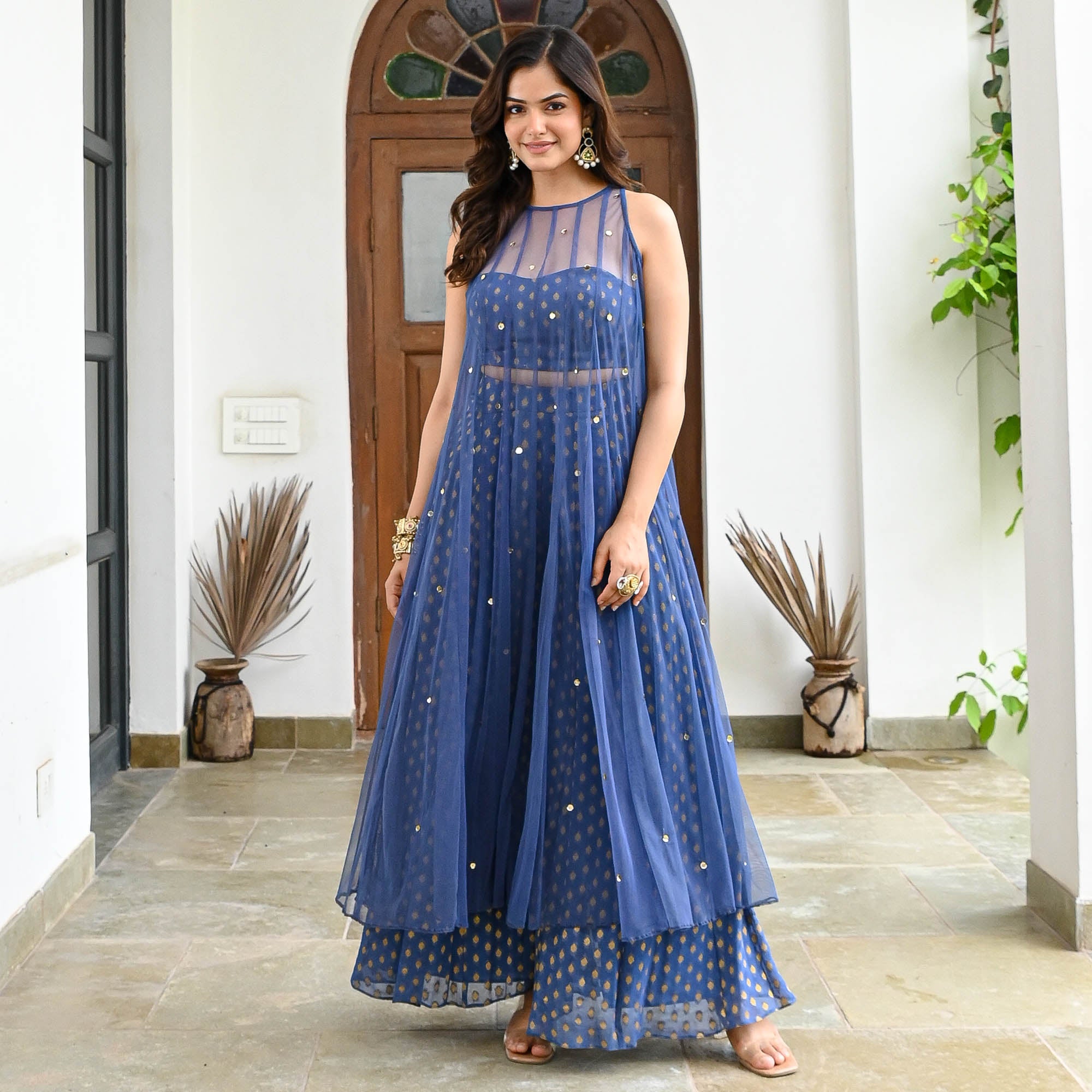 Chic and contemporary, the Zoha Co-ord Set in bluish grey jacquard makes a bold statement. Featuring a structured tube bustier and flared palazzos, this set is elevated with a sheer net overlay that adds a hint of drama and elegance. Perfect for cocktail nights or festive soirées, it’s a fusion look that turns heads effortlessly.